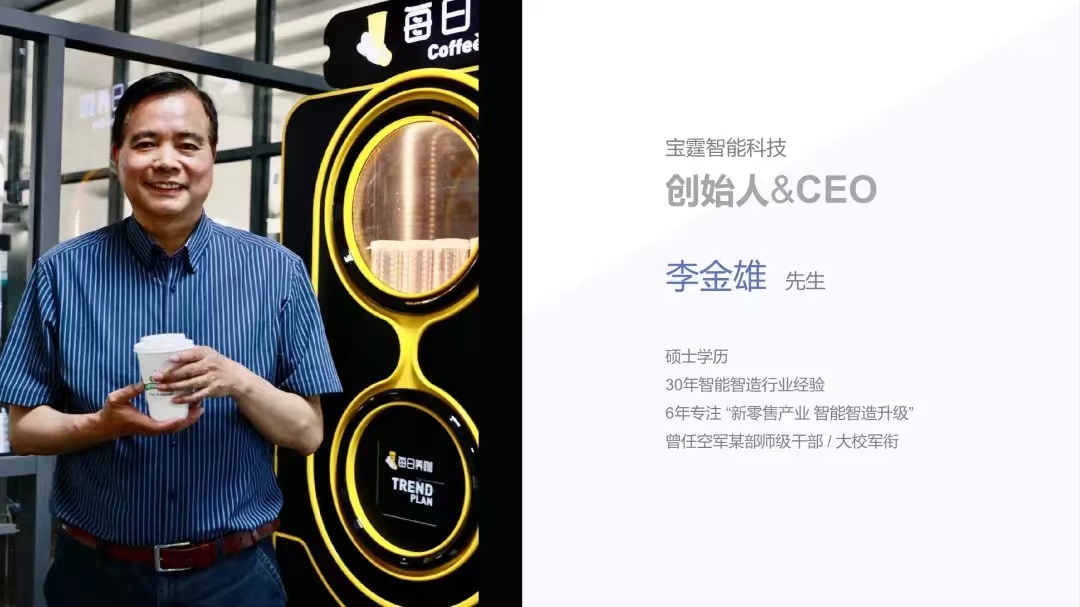 上海宝霆智能科技有限公司创始人李金雄,硕士学历,曾荣获三等功五次。这位退役军人转业后选择在上海自主创业,他的身上洋溢着军人的情怀和勇于挑战、爱拼会赢的闽商精神。2019 年,公司运用智能引流和云技术为传统自动售卖机注入新活力,如今主要生产智能咖啡机等产品,上海浩瑶实业发展有限公司则专注新零售业态,拥有领先的智能售货机、自助饮料机、自动综合机、自动奶咖机等。这些产品已成功入驻上海财经大学、京东集团客服中心、上海长海医院、太平洋保险等机构,获得良好评价。